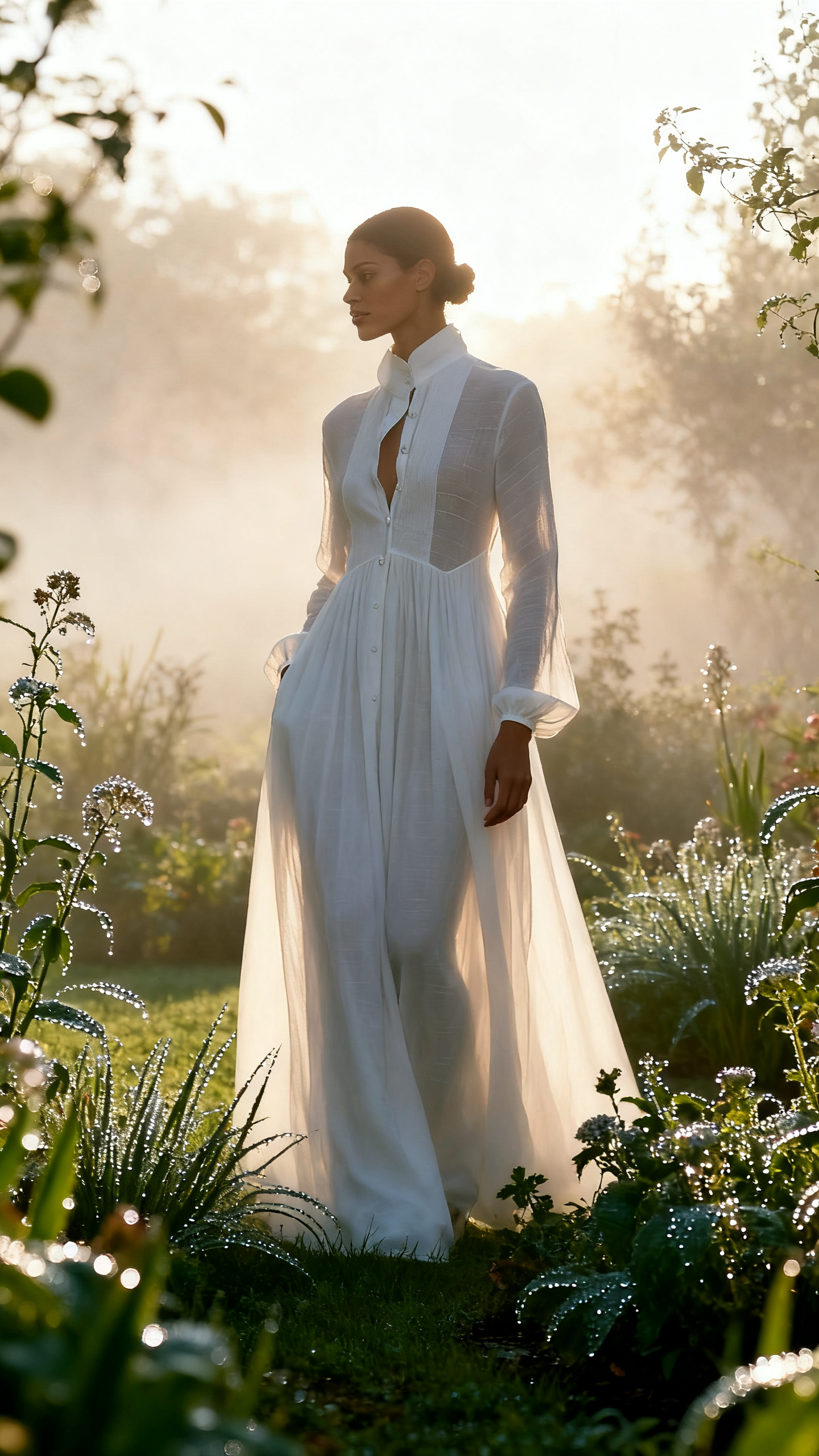 Minimalist maxi dress made from a refined cotton and linen blend, featuring patchwork details, a structured high neckline, and a single-breasted front closure. A timeless essential with a natural and elegant feel, ideal for a clean and effortless look.